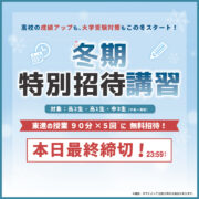 東進衛星予備校JR奈良駅前校では、冬期特別招待講習を実施しています。そして、無料で3講座申込ができるのは本日が締切となります!(1講座は90分授業×5回+講座修了判定テストほか、3講座申込で最大15回授業を受けられます!)