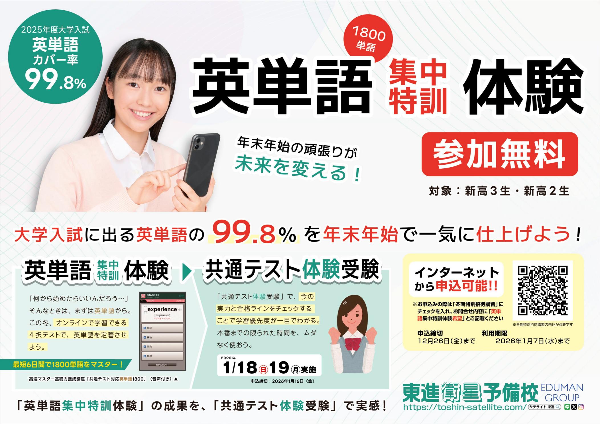 東進式の中学生専用プログラム。中学内容を中2までに修了、高校内容を早期にスタート・修了させることにより、最難関大学合格に欠かせない、過去問対策に圧倒的な時間を割くことができます。