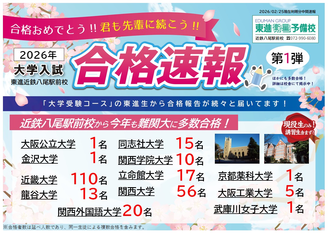 エリア大阪府八尾市 対象高校生・高卒浪人生・中学生(中高一貫校生)